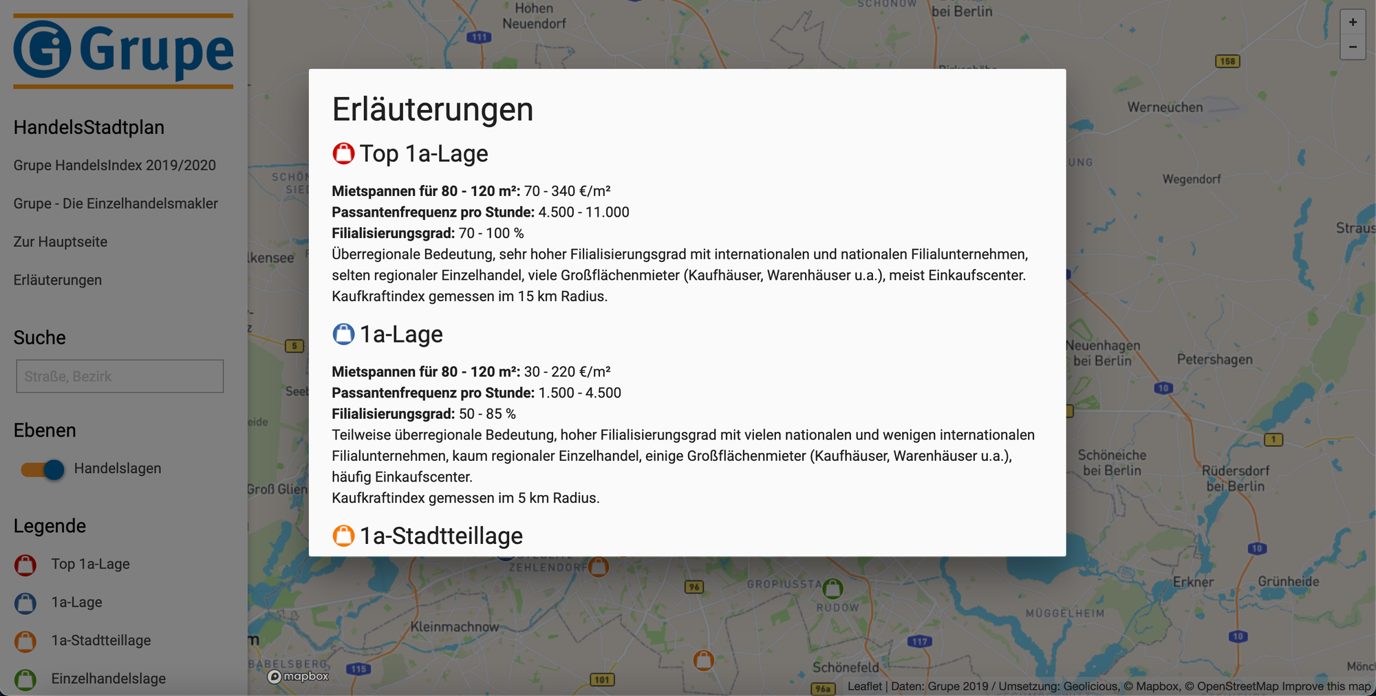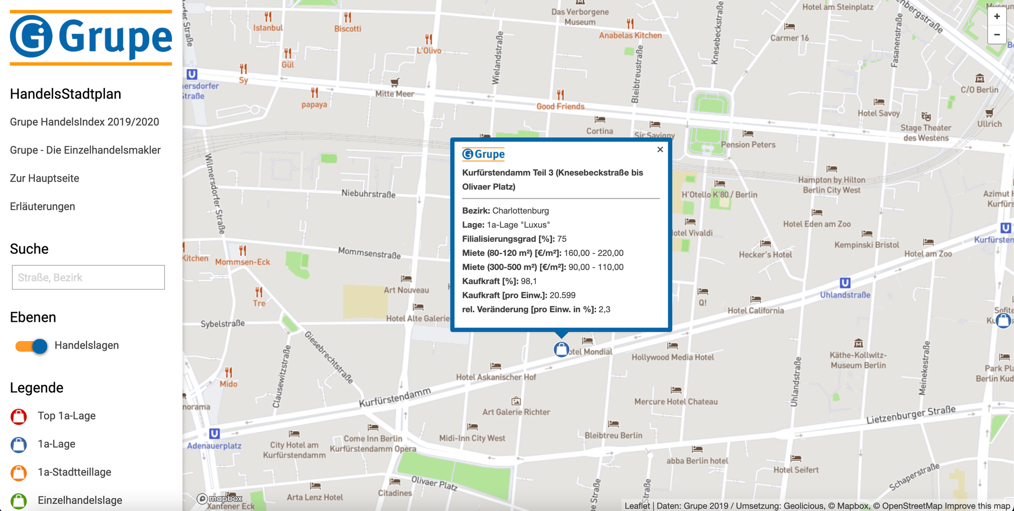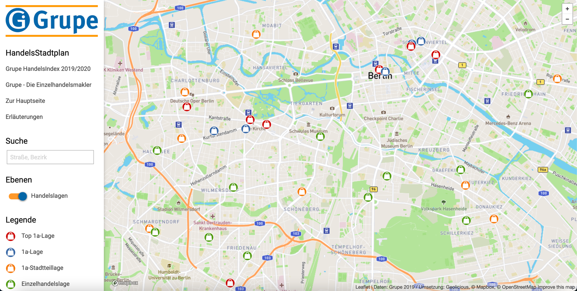 „Die Firma Geolicious hat die Idee, unseren Grupe HandelsIndex online und interaktiv in einer Karte umzusetzen, hervorragend gelöst, so hat man die Stadt Berlin und alle 63 Berliner Einkaufsstraßen im Überblick und kann sich zugleich alle wichtigen Informationen zu der jeweiligen Lage anzeigen lassen. Wir danken Geolicious für ihre kompetente Beratung und die tolle Umsetzung!“