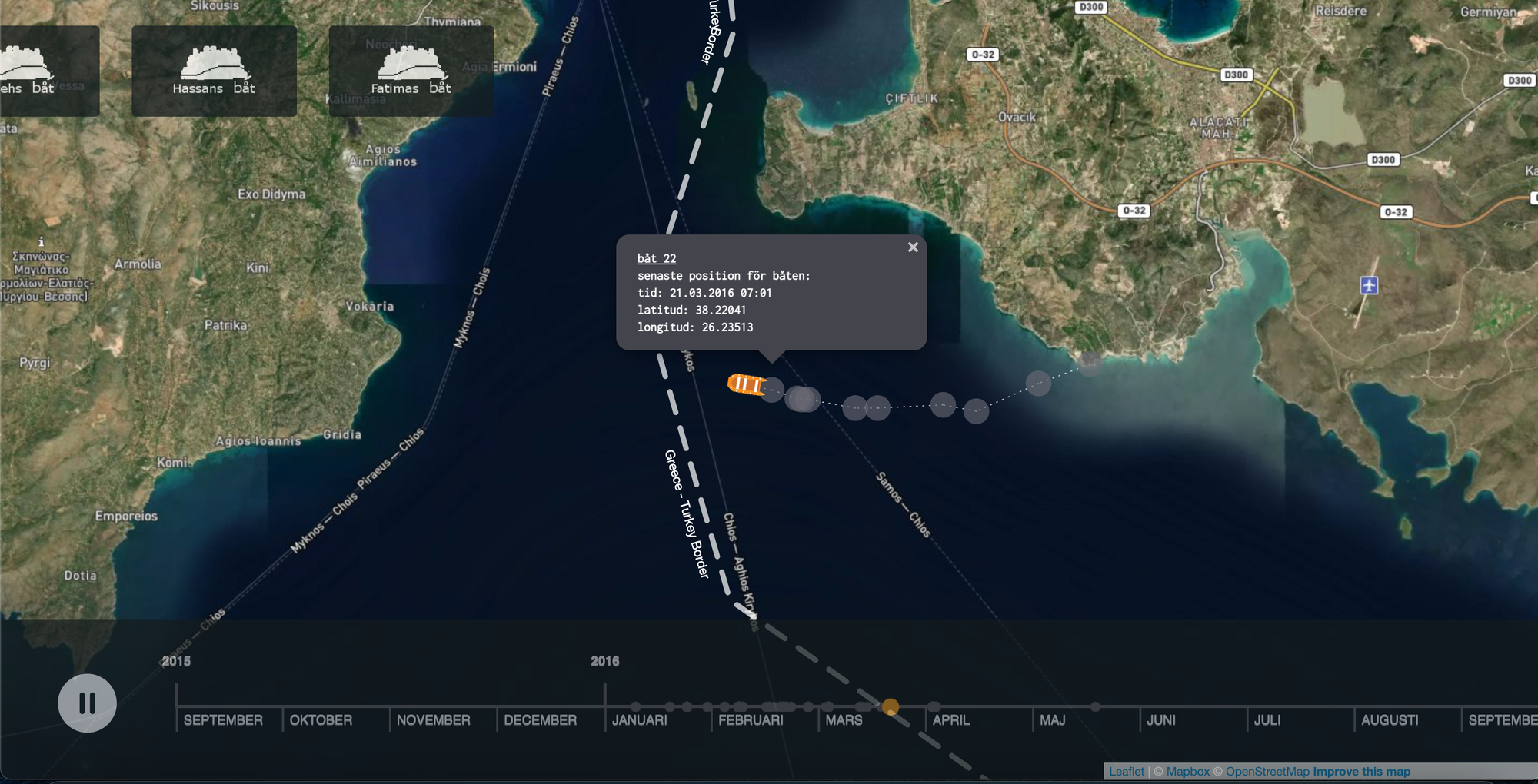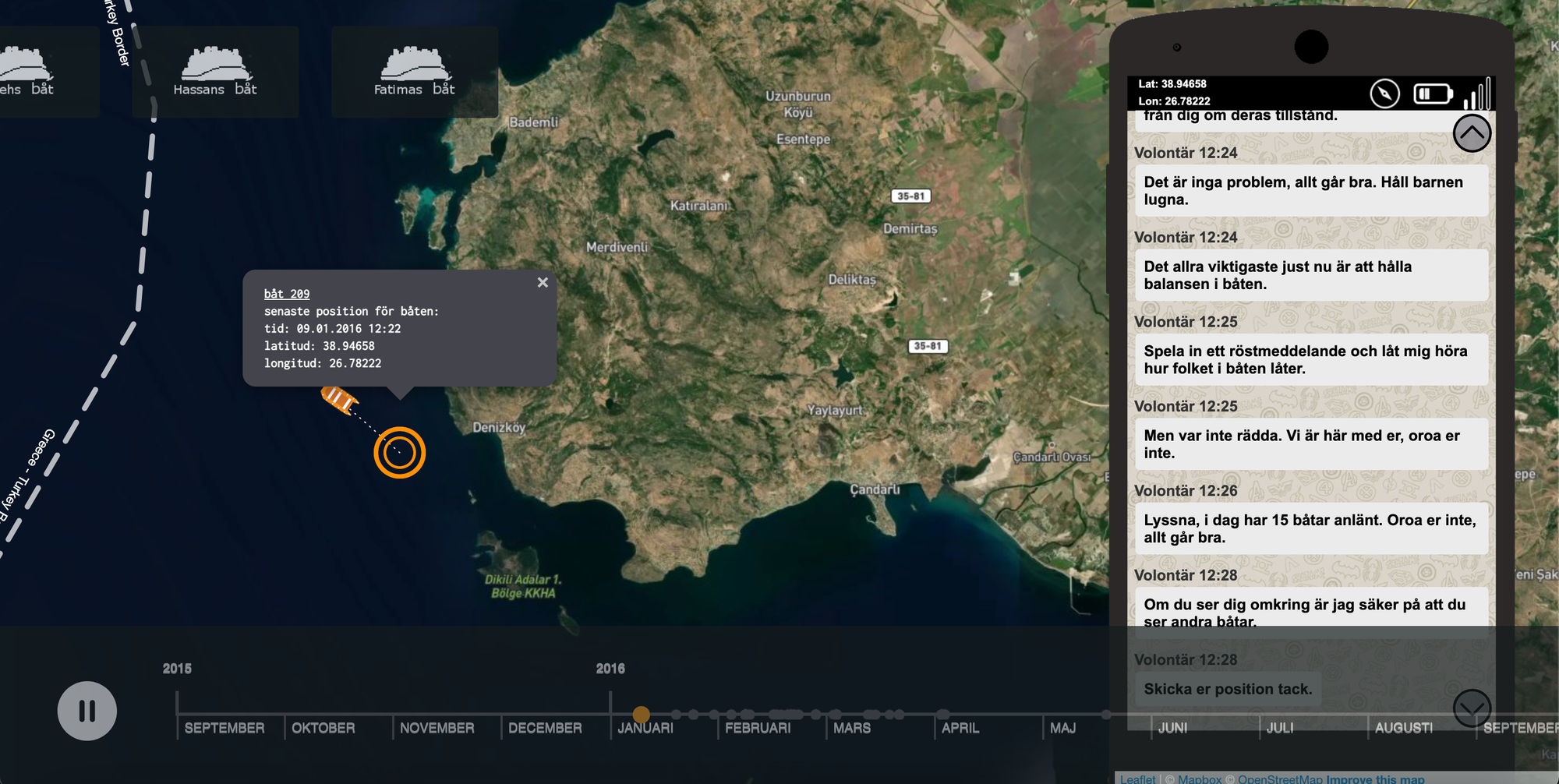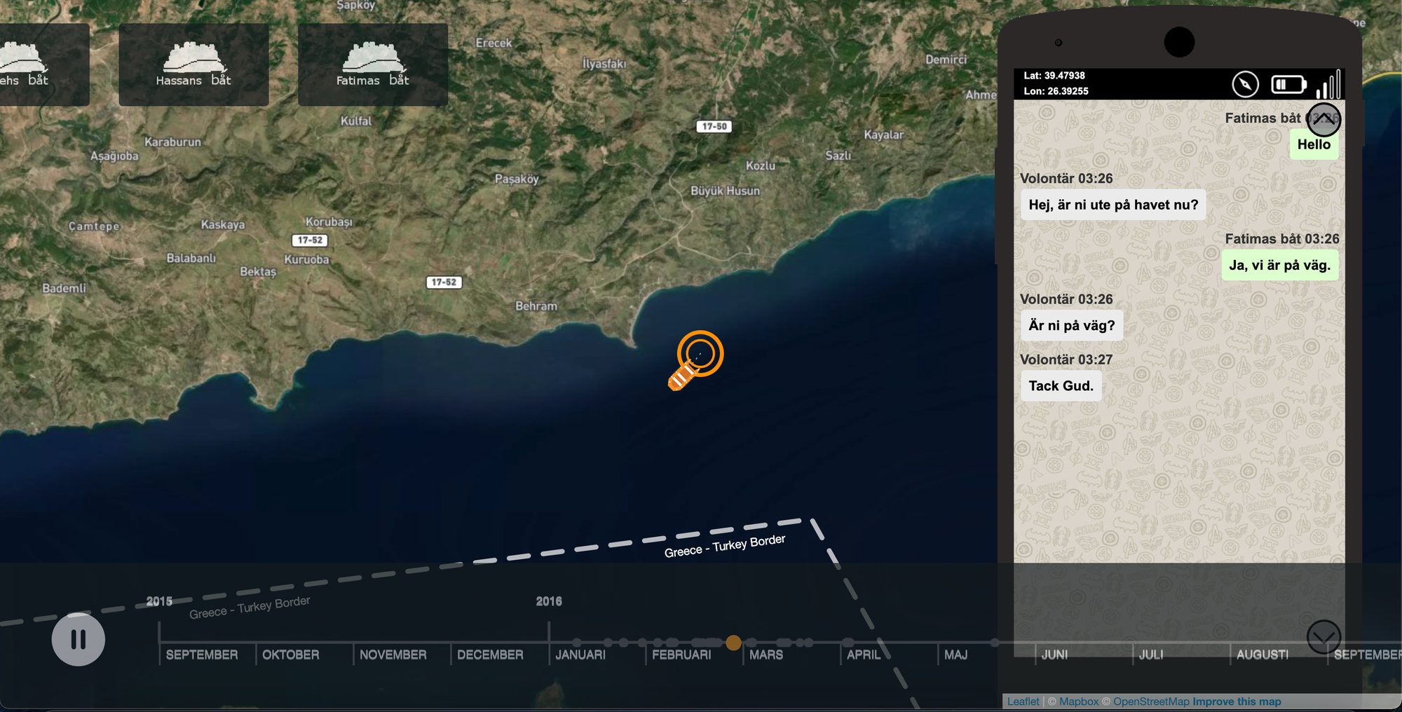 Im Rahmen einer Ausstellung im Technischen Museum Stockholm im Jahr 2016 entwickelten wir eine interaktive Anwendung, die die Rolle digitaler Kommunikation und Medien in dieser Ausnahmesituation sichtbar machte. Zentrales Element war die Visualisierung realer Daten: Messenger-Chatverläufe und GPS-Koordinaten, die von Geflüchteten auf See geteilt wurden, wurden zu interaktiven Logbüchern einzelner Überfahrten verarbeitet. Die Anwendung war Teil einer musealen Medieninstallation und wurde auf einem großen Touch-Display im Kioskbetrieb präsentiert.